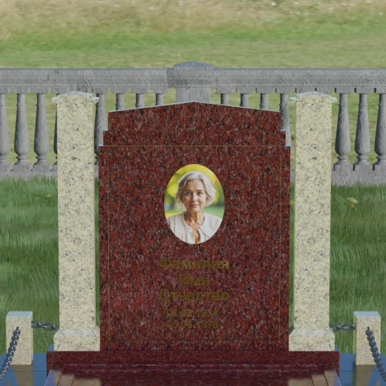 Главной особенностью данного комплекса являются две декоративные колонны, обрамляющие центральную стелу. Эти стройные вертикальные столбы не просто дополняют дизайн, но и служат символом опоры, духовной стойкости и незыблемости памяти. Контрастное сочетание фактур и цветов, представленное в разных вариациях модели, позволяет расставить акценты: выделить центральную часть для портрета или, наоборот, подчеркнуть строгость боковых пилонов. Зеркальная полировка каждой грани создает удивительную игру света — поверхность камня отражает мир вокруг, словно запечатлевая в себе само течение времени, при этом сохраняя безупречный блеск на многие десятилетия.