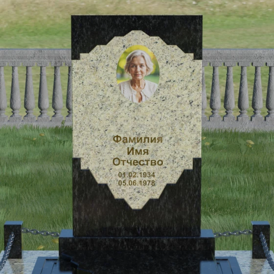 Данное ритуальное изделие представляет собой подлинный триумф художественного минимализма и гармонии контрастов. Центральным элементом композиции является вертикальная стела, выполненная в уникальной технике сочетания двух видов природного камня. Геометрия изделия строится на строгих, безупречно выверенных линиях внешнего контура и изысканной, фигурной резьбе внутреннего сегмента. Светлая вставка из мелкозернистого гранита, обрамленная темным камнем, напоминает античный портал или драгоценную раму, выполненную в стиле барокко. Фигурные фаски по краям светлого элемента создают ритмичный узор, который смягчает строгость прямоугольной формы, придавая мемориалу индивидуальность и торжественность.