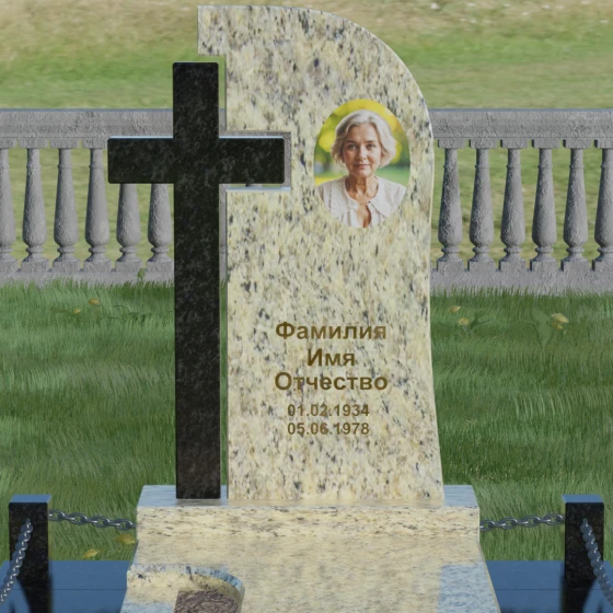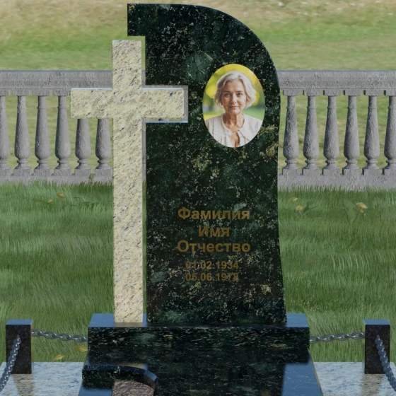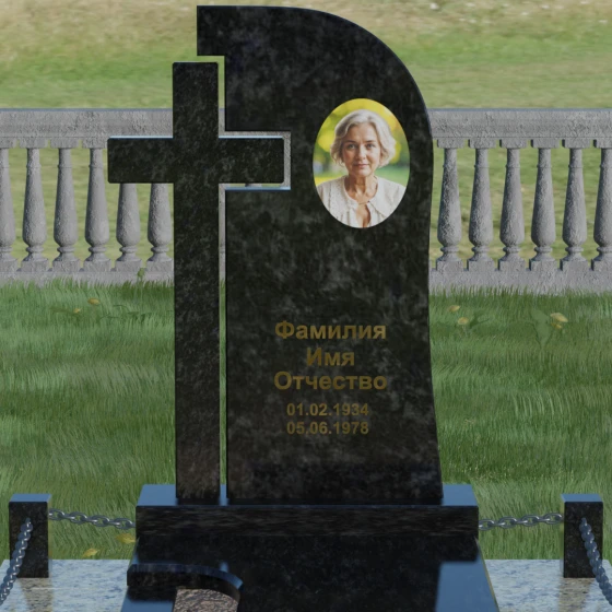 Правая часть стелы — это широкое каменное полотно с мягким, плавным изгибом в верхней части, напоминающим небесный свод или церковный купол. Контраст между прямолинейностью креста и текучестью основной плиты создает уникальный художественный ритм. Боковые грани и верхушка изделия отполированы до зеркального блеска, в котором отражается небо, в то время как глубокая гравировка текста и портрета в овальной нише подчеркивают индивидуальность монумента. Особую массивность конструкции придает основание — монумент возведен на высокий гранитный цоколь. По периметру установлены монументальные столбики с декоративными фасками, соединенные массивными цепями, что создает защищенный контур и атмосферу уединенного покоя.