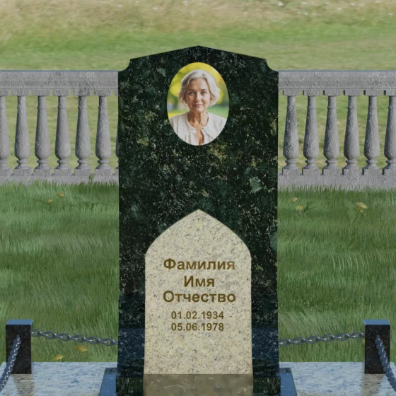 Данное надгробие из натурального камня представляет собой архитектурный ансамбль, в котором строгость линий гармонично сочетается с мягкостью художественных акцентов. Визуальный центр композиции — сложная вертикальная стела, выполненная в технике комбинирования двух контрастных пород. Основное полотно из темного, зеркально отполированного камня служит благородным фоном, на котором особенно выразительно смотрится светлая фигурная вставка. Эта вставка, имеющая форму стрельчатой арки, словно открывает «портал» памяти, создавая чистую и светлую зону для нанесения имен и памятных дат. Верхняя грань стелы завершается изящным пятигранным сводом, напоминающим очертания храмовой архитектуры, что придает монументу возвышенный и одухотворенный вид. Игра текстур — от глубокого черного глянца до зернистой матовости светлого гранита — создает объем, который меняется в зависимости от угла зрения.