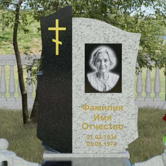 Форма стелы, сочетающая в себе прямые линии основания и волнообразный верх, символизирует земной путь, переходящий в бесконечность. Плавная волна отождествляется с чистотой помыслов и спокойствием, которое обретает душа. Вертикальный элемент с крестом выступает в роли духовного оберега, символизируя непоколебимую веру и защиту. Использование двух контрастных видов камня (светлого и темного) олицетворяет единство противоположностей: светлой памяти и земной печали, временного бытия и вечной жизни.