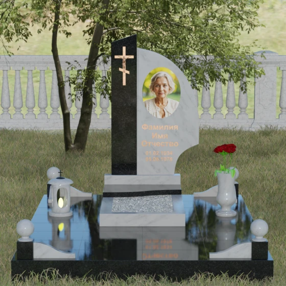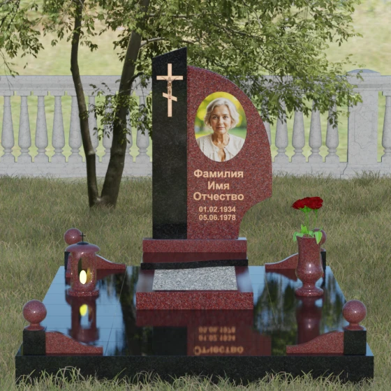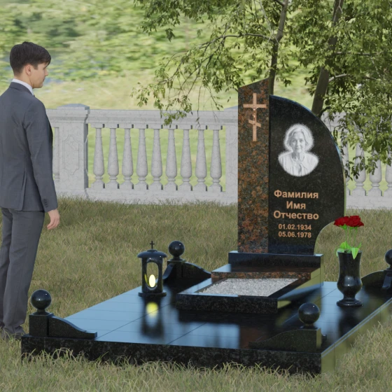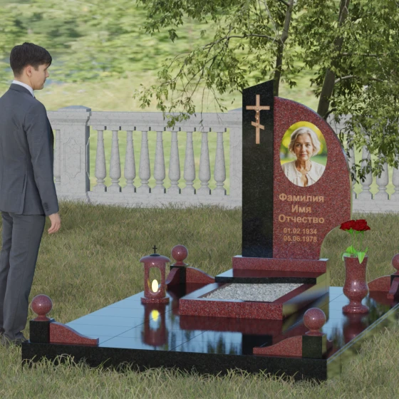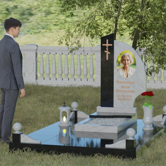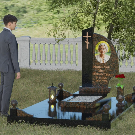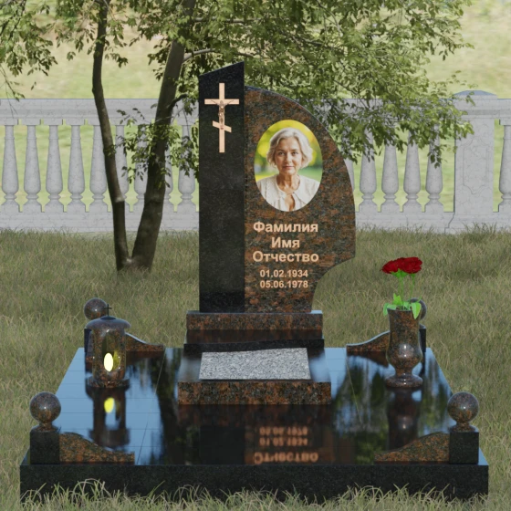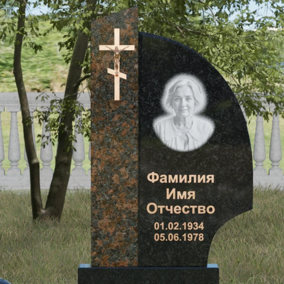 Оформление и советы искусствоведа: Для данной модели идеально подходит гравировка портрета в овальном или круглом формате, размещенная в верхней части «волнообразной» стелы. Это уравновешивает массивность левой части с крестом. Текст (ФИО и даты) рекомендуется выполнять глубоким академическим шрифтом с последующим покрытием сусальным золотом или «под бронзу», чтобы поддержать цветовую гамму распятия. Зеркальная полировка камня обеспечит четкость гравировки, которая не потускнеет и через сто лет, требуя лишь минимального ухода — протирки мягкой ветошью.