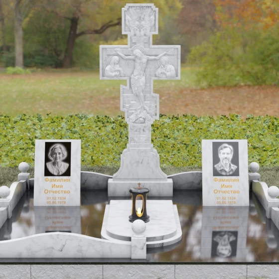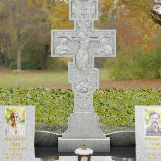 Данный мемориальный ансамбль представляет собой совершенный баланс между духовными традициями и современной архитектурной эстетикой. В центре композиции находится величественная стела в форме высокого православного креста, украшенного детальной многоуровневой резьбой. Барельефное изображение Распятия, выполненное с глубокой проработкой каждой детали — от складок плащаницы до ликов предстоящих, — создает ощущение покоя и благодати. Светлая, матовая фактура резного камня эффектно контрастирует с зеркально отполированными боковыми элементами, предназначенными для увековечивания памяти близких.