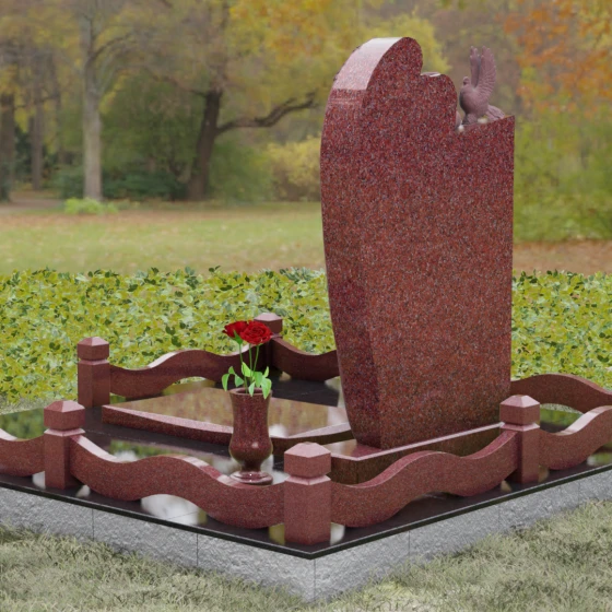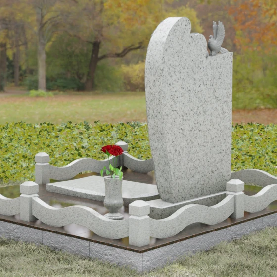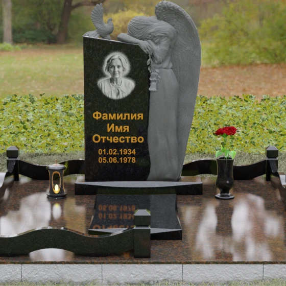 Представленный мемориальный ансамбль (Артикул 129) — это не просто памятный знак, а глубокое архитектурное высказывание, в котором застывшая в камне скорбь обретает форму высокого искусства. Величественная стела доминирует в композиции, представляя собой сложный симбиоз строгой геометрии и филигранной художественной резьбы. Центральным элементом является объемная фигура скорбящего ангела, выполненная в технике глубокого барельефа. Мастерски переданная пластика крыльев с детальной проработкой каждого перышка создает ощущение мягкости, которая парадоксальным образом контрастирует с твердостью натурального камня. Склоненный лик ангела и тонкие складки его одеяний, выполненные в матовом срезе, эффектно выделяются на фоне зеркально полированной поверхности основной плиты. В руках небесного покровителя застыла роза — символ вечной любви, чьи лепестки проработаны с исключительным вниманием к объему и естественности линий.