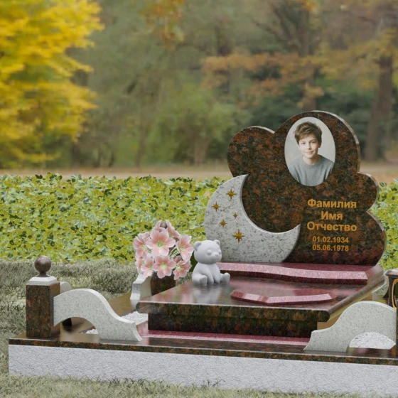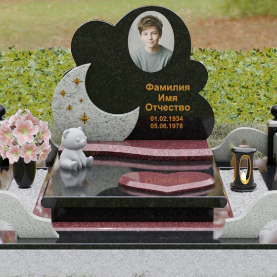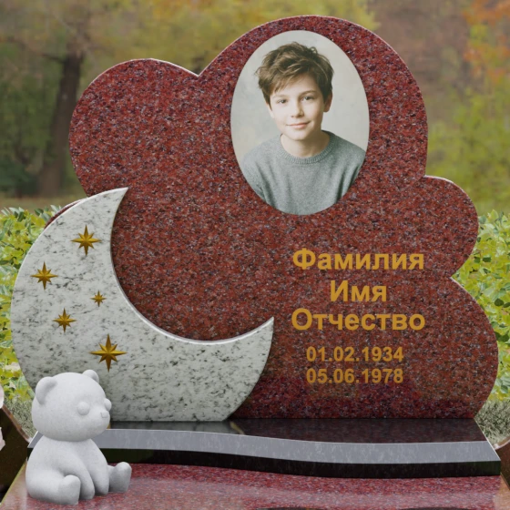 Данная мемориальная композиция — это воплощение нежности, глубокой любви и тихой грусти, застывшей в благородном камне. Выбор такой формы продиктован желанием выразить самые светлые чувства к ушедшему близкому человеку. Силуэт стелы, выполненный в виде мягкого, кучевого облака с плавными, округлыми очертаниями, символизирует покой и вечную жизнь души в небесных сферах. Асимметричная геометрия придает монументу индивидуальность, выделяя его среди строгих прямоугольных форм, и создает ощущение легкости, несмотря на внушительный вес натурального гранита. Особый акцент сделан на игре фактур и цветов: основная часть монумента из темного камня гармонично сочетается со вставкой из светлого гранита в форме изящного полумесяца. На этом светлом фоне выгравированы лаконичные золотые звезды, которые словно освещают путь памяти через десятилетия.