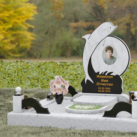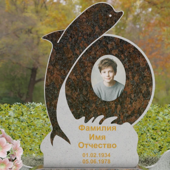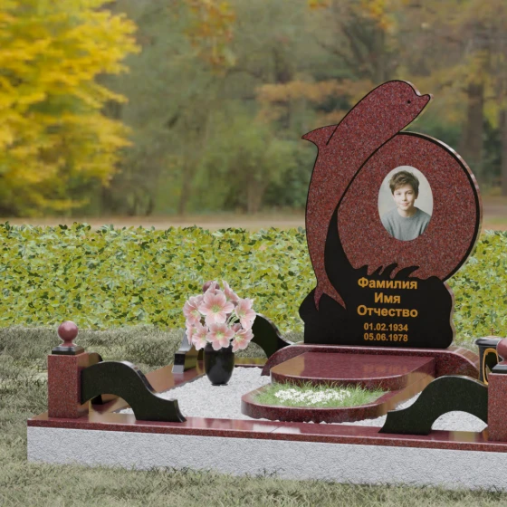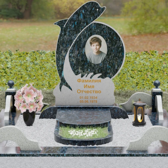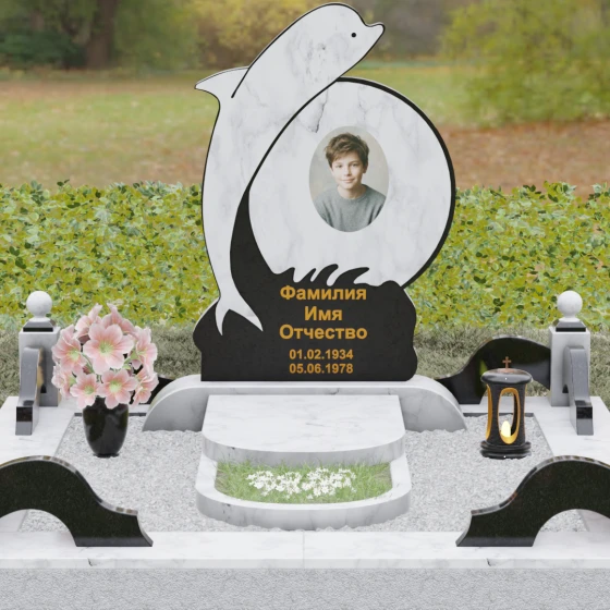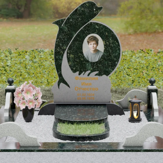 Этот гранитный монумент представляет собой не просто мемориальный знак, а настоящую художественную композицию, преисполненную глубокого символизма. Центральное место в дизайне занимает фигура дельфина — древнего символа спасения, чистоты и проводника душ в лучший мир. Плавный, динамичный изгиб морского обитателя словно обнимает центральный медальон, создавая защищенное, камерное пространство для портрета близкого человека. Мастера добились удивительной игры контрастов: зеркально отполированное туловище дельфина эффектно выделяется на фоне матовой, детально проработанной резьбы в основании, имитирующей морскую пену и гребни волн.