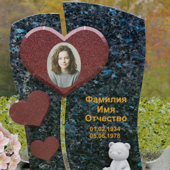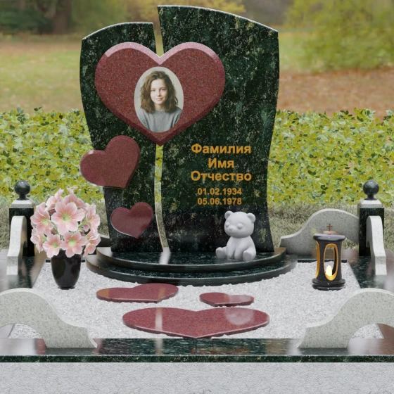 Этот величественный гранитный монумент представляет собой высокохудожественное произведение, в котором каждая линия наполнена глубоким смыслом. Композиция обелиска построена на волнующем контрасте разделения и единения. Массивная вертикальная плита словно рассечена плавной, изогнутой линией на две неравные части, символизируя разлом, произошедший в жизни. Однако эти части не распадаются — их крепко и неразрывно соединяет главное связующее звено: крупное, объемное сердце. Этот центральный элемент, выполненный в контрастном цвете (например, насыщенно-красном на фоне строгого черного или глубокого зеленого камня), служит идеальным обрамлением для портрета, акцентируя внимание на светлом образе ушедшего человека. Слева, вдоль изгиба, каскадом расположены еще три сердца меньшего размера, создавая ритмичный визуальный ряд, подобный биению любящей души. Вся поверхность камня, включая сложные криволинейные резы, отполирована до идеального зеркального блеска, придавая конструкции торжественность и монументальность.
