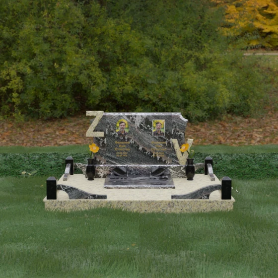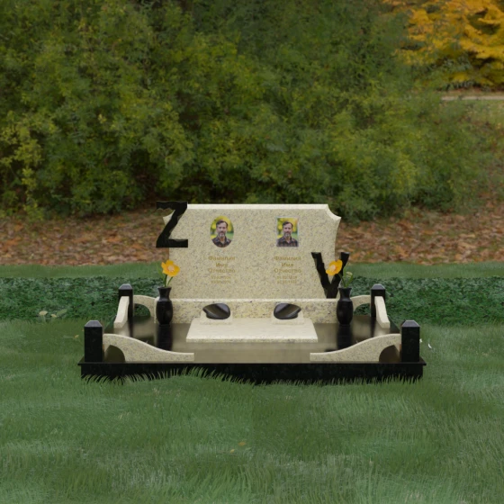 Центральным элементом изделия является массивная горизонтальная стела, обладающая сложной многоуровневой геометрией. Верхняя грань плиты украшена изящными симметричными вырезами, которые смягчают строгость прямоугольных форм и придают конструкции завершенный, эстетически выверенный вид. Особое внимание привлекает игра контрастов: глубокая зеркальная полировка основного массива камня эффектно подчеркивается светлыми вставками. Рельефные буквы Z и V, выполненные из контрастного гранита, выступают над поверхностью, создавая впечатляющий эффект объема и наделяя монумент уникальным характером.