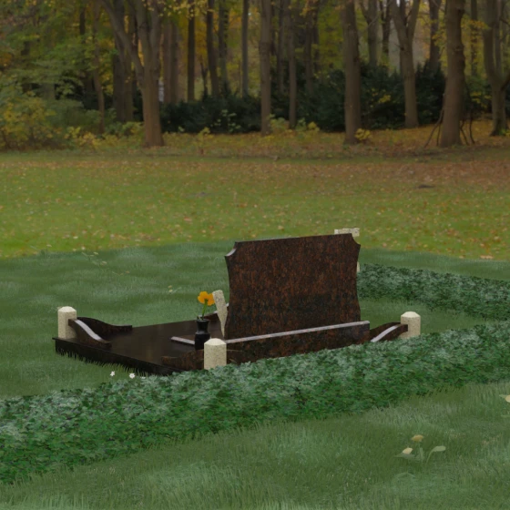 Данная мемориальная композиция включает в себя полное благоустройство участка, что избавляет от необходимости дополнительного оформления. Основанием служит высокий гранитный цоколь, обеспечивающий устойчивость и долговечность всей конструкции. Территория полностью закрыта монолитными надгробными плитами с зеркальной полировкой — это не только придает захоронению величественный вид, но и значительно упрощает уход, предотвращая рост сорной травы и скопление влаги.