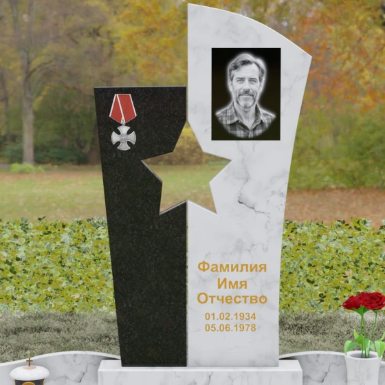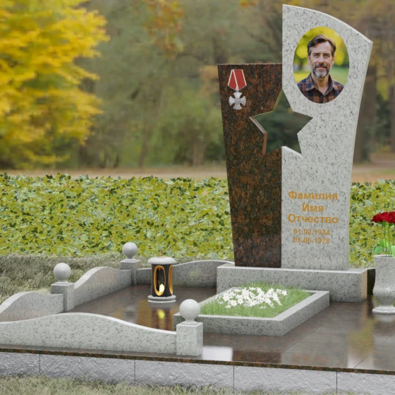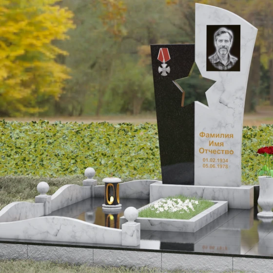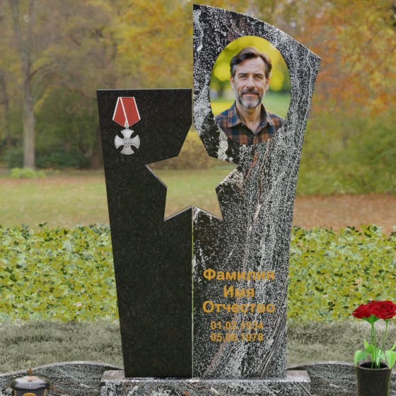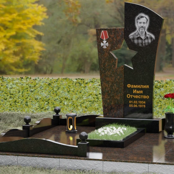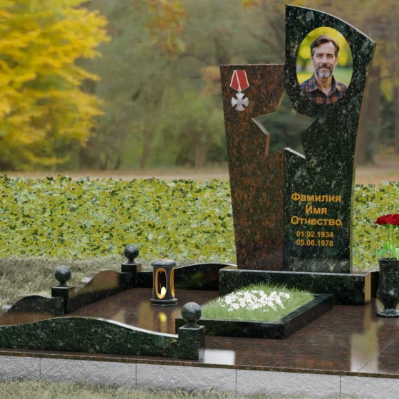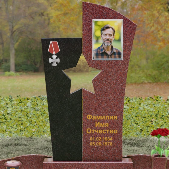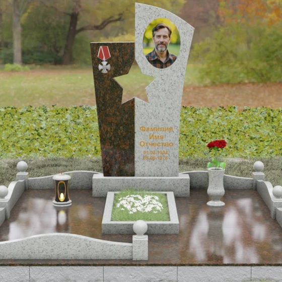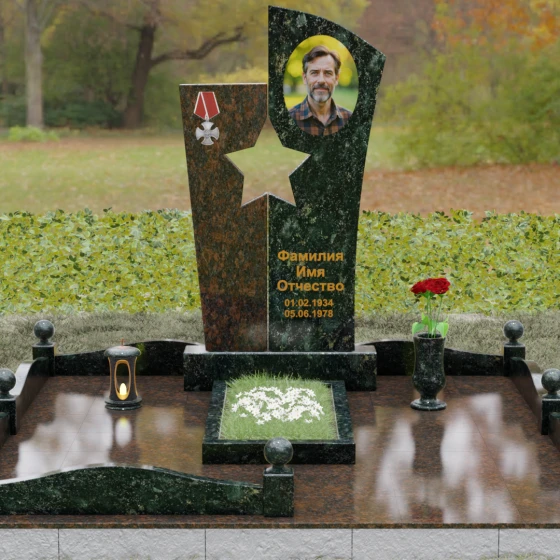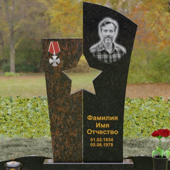 Оформление: Для данной модели рекомендуется использование высокохудожественной лазерной или ручной гравировки портрета на темном полотне камня. Золочение букв эпитафии идеально дополнит образ звезды и ордена, создавая торжественный и статусный вид. Широкое поле правого блока позволяет разместить не только даты жизни, но и важные слова, которые останутся в камне навсегда.