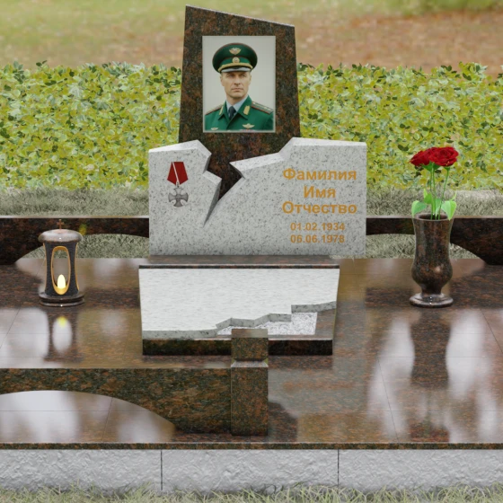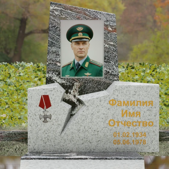 Представленная вашему вниманию величественная стела (Артикул 187) — это не просто мемориальный знак, а глубокое художественное произведение, в котором запечатлена эстетика мужества и непоколебимой воли. Композиция построена на резком, драматичном контрасте двух видов камня и сложных геометрических форм. Верхний сегмент, выполненный из глубокого черного гранита с зеркальной полировкой, устремлен ввысь, символизируя чистоту помыслов и вечный покой. Его асимметричный срез придает монументу динамику и современный вид. Нижняя часть комплекса, созданная из фактурного красно-коричневого гранита, олицетворяет земную твердь и крепость характера. Особого внимания заслуживает художественный разлом — рваная, зигзагообразная линия соприкосновения двух плит. Этот «разлом времени» выглядит максимально натуралистично, создавая визуальное ощущение мощи, способной преодолеть саму смерть. На левой стороне мемориала гордо расположена объемная резьба в виде ордена Мужества с алой лентой, что подчеркивает особый статус и заслуги усопшего.
