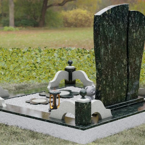 Данный мемориальный комплекс — это воплощение эстетики и надежности. Сложная геометрия стелы, дополненная профессионально выполненным цоколем и декоративными элементами, превращает место памяти в благородный символ любви, который не подвластен времени и природным стихиям.
