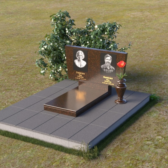 Этот памятник представляет собой изысканную композицию, где строгость линий сочетается с плавными, утонченными деталями. Стела имеет прямоугольную форму с асимметричной верхней гранью. С левой стороны верхний угол плавно скошен вниз, создавая ощущение ниспадающей драпировки или крыла ангела, оберегающего покой усопших. Правый верхний угол стелы остается прямым, что придает конструкции визуальную устойчивость и завершенность. Боковые грани стелы тщательно отполированы, что создает эффект зеркального блеска, отражающего окружающий мир и символизирующего связь между земным и небесным. Под стелой располагается горизонтальная плита меньшего размера, также выполненная в зеркальной полировке, создавая эффект единого целого и усиливая визуальную глубину композиции. Все элементы памятника установлены на широкое основание, облицованное плиткой серого цвета, что обеспечивает устойчивость и долговечность конструкции.