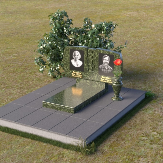 Геометрия модели тщательно продумана. Верхняя часть стел имеет скругленные углы, смягчающие строгость линий и придающие композиции более человечный облик. Между портретами выгравирован лаконичный православный крест, напоминающий о духовности и вере. Основание стел переходит в горизонтальную плиту, образуя единую плоскость с надгробной плитой. Надгробная плита выполнена в виде прямоугольника с полированной поверхностью, отражающей небо и окружающий мир. У основания композиции располагается аккуратная ваза из черного гранита, предназначенная для живых цветов, как символ непреходящей любви и уважения.