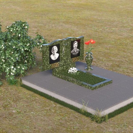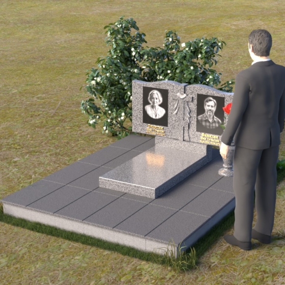 Данная мемориальная композиция представляет собой две стелы, выполненные из полированного гранита глубокого черного цвета, соединенные между собой. Каждая стела имеет мягкую, волнообразную форму верхней части, словно склоненную в тихой скорби. Боковые грани плавно скруглены, что придает изделию мягкость и элегантность. На лицевой поверхности стел выгравированы портреты, имена и даты, выполненные с высокой детализацией. Разделяет стелы искусно вырезанный крест, лаконичный и строгий, устремленный ввысь. Его грани контрастируют с полированной поверхностью, создавая игру света и тени, придающую рельефу дополнительный объем. Под стелами располагается горизонтальная плита, также выполненная из черного гранита, с зеркальной полировкой, отражающей небо и окружающий мир, символизируя вечность и непрерывность жизни. Дополняет композицию изящная ваза из гранита, предназначенная для живых цветов, которые станут символом любви и памяти.