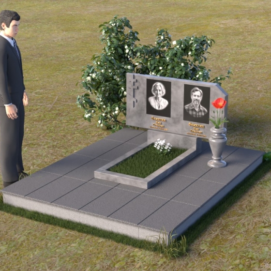 В верхней части памятника располагается вертикальная стела прямоугольной формы с небольшими скошенными углами, придающими ей более мягкий и благородный вид. На поверхности стелы размещены два портрета усопших, выполненные с высокой детализацией. В левом верхнем углу вырезано изображение православного креста, выполненного в лаконичном стиле, подчеркивающем сдержанность и глубину веры. Справа от портретов вырезана изящная роза с детально проработанными лепестками, символизирующая любовь и вечную память. Нижняя часть стелы плавно переходит в горизонтальную плиту, на которой размещается табличка с именами и датами жизни усопших. Горизонтальная плита, в свою очередь, опирается на строгий постамент, обеспечивающий устойчивость всей конструкции.