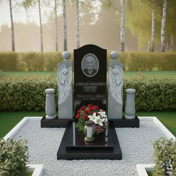 Этот мемориал вызывает чувство светлой печали и глубокого уважения к памяти ушедшего. Ангелы, словно оберегают его сон, а строгие формы и лаконичность дизайна подчеркивают достоинство и благородство. Закрытая надгробная плита облегчает уход за местом захоронения, предотвращая рост сорняков и сохраняя опрятный вид. Гладкая поверхность камня препятствует скоплению пыли и грязи.