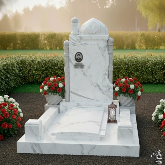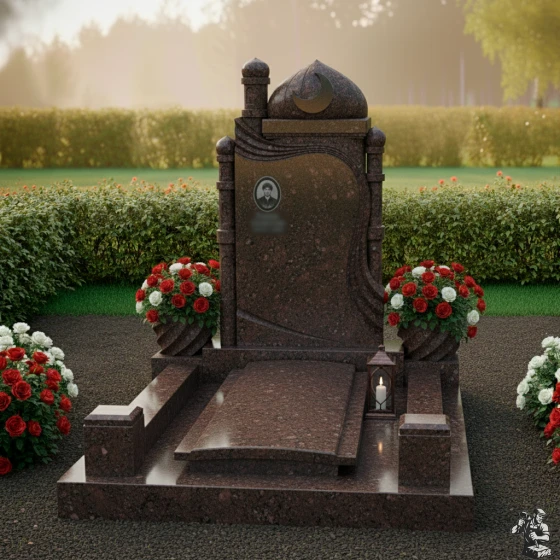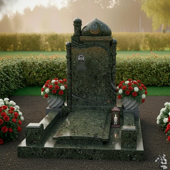 Модель ПН 088 — это не просто мемориальная плита, а подлинное произведение искусства, воплощающее в себе глубокую символику и эстетику восточной архитектуры. Центральная стела, выполненная в глубоком черном цвете, словно портал в мир воспоминаний, обрамлена изящными резными элементами. Ее форма напоминает величественную арку, увенчанную куполом мечети и полумесяцем со звездой — древними символами веры и духовности. Эти элементы выполнены с потрясающей детализацией: каждый изгиб купола, каждая грань минарета, каждый луч звезды проработан до совершенства, создавая ощущение легкости и воздушности, несмотря на монолитность камня. Изящная драпировка, струящаяся по бокам стелы, придает композиции динамичность и мягкость, символизируя скорбь и умиротворение. Контраст между зеркальной полировкой основной черной плиты, на которой будет сиять портрет и имя, и деликатной, чуть шероховатой фактурой светлых резных элементов, создает глубокий визуальный эффект, подчеркивая монументальность и изысканность. Этот контраст играет на свету, меняя оттенки и глубину, что делает монумент живым и многогранным.