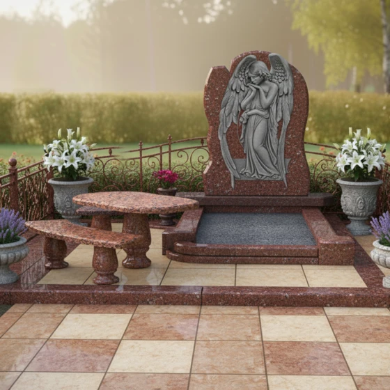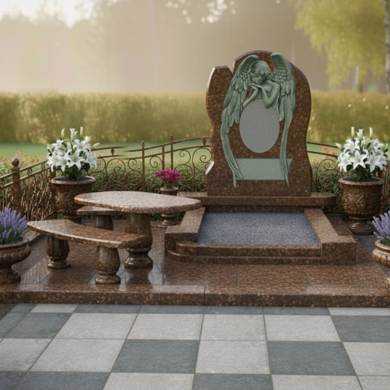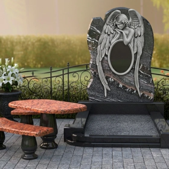 Форма стелы с ее арочным силуэтом и центральным резным изображением скорбящего ангела предоставляет широкие возможности для размещения портрета усопшего. Наиболее гармонично портрет будет смотреться в верхней части стелы, над фигурой ангела, или же в центральной части, если изображение ангела будет смещено вниз или выполнено в виде барельефа. Зеркальная полировка поверхности идеально подходит для высококачественной гравировки портрета и эпитафии, обеспечивая четкость линий и долговечность изображения. Благодаря гладкой поверхности камня, портрет будет выглядеть максимально выразительно, а отражающая способность полировки придаст ему особую глубину и объем. Выбор шрифта для эпитафии также играет важную роль: классические, строгие шрифты подчеркнут серьезность и торжественность момента, в то время как более изящные и каллиграфические могут добавить нотку индивидуальности. Этот мемориальный комплекс — это не просто камень, это архитектурное произведение, призванное сохранить светлую память о человеке и стать местом утешения для близких. Он станет вечным свидетельством любви и уважения, воплощенным в прочном и прекрасном материале.