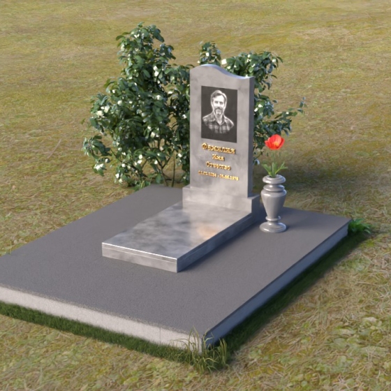Представленная мемориальная композиция отличается лаконичностью и элегантностью. Ее строгие формы, смягченные плавными изгибами, символизируют как жизненный путь, так и обретение покоя. Верхняя часть стелы имеет мягкий, едва заметный изгиб, словно склоняясь в знак уважения. Грани стелы деликатно обработаны, что придает ей завершенный и благородный вид. На лицевой стороне выгравированы портрет усопшего и памятные надписи, выполненные с особой тщательностью.