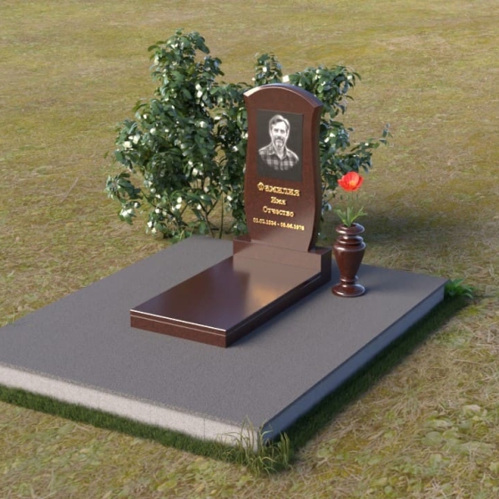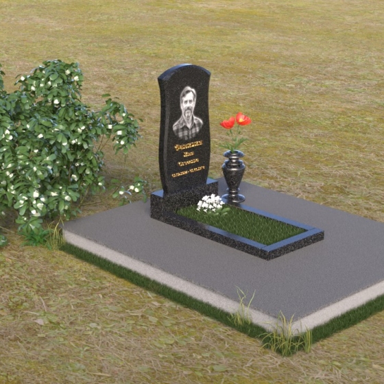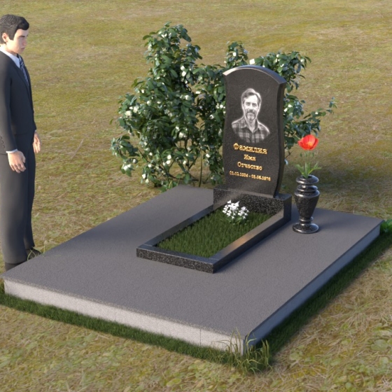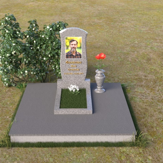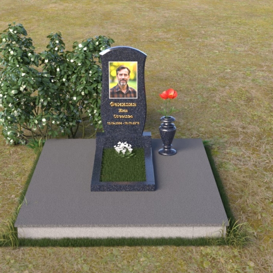 Данная модель предоставляет широкие возможности для индивидуального оформления. Портрет усопшего, выполненный методом гравировки, идеально вписывается в общую композицию, занимая центральное место на стеле. Золотистые буквы надписи, контрастируя с темным фоном полированного гранита, выглядят торжественно и выразительно. Мы рекомендуем выбирать фотографии высокого разрешения для достижения максимальной детализации и реалистичности портрета. Также возможно добавление дополнительных декоративных элементов, таких как эпитафии, религиозные символы или памятные даты. Небольшая подставка, выполненная в том же стиле, что и стела, гармонично дополняет композицию и может служить местом для возложения цветов. Элегантная ваза из черного гранита, расположенная рядом с надгробием, добавляет завершенность образу и позволяет сохранить свежесть цветов на длительное время.